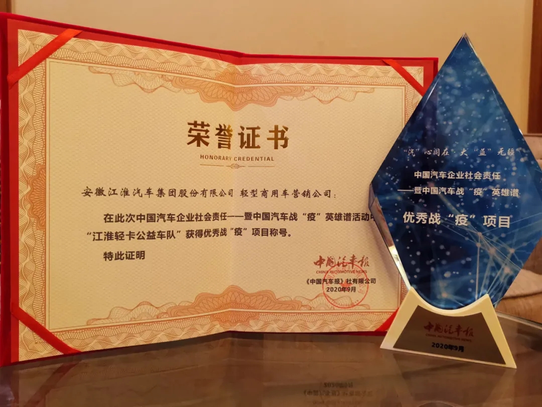 9月10日, 由《中國汽車報》社主辦的中國汽車企業(yè)社會責(zé)任暨中國汽車戰(zhàn)“疫”英雄譜頒獎典禮在北京舉行。江淮汽車榮獲優(yōu)秀戰(zhàn)“疫”擔(dān)當(dāng)企業(yè)稱號、江淮輕卡公益車隊榮獲項目組優(yōu)秀戰(zhàn)“疫”項目稱號。
